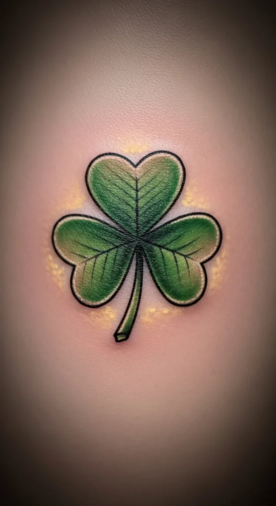 A halo adds a warm touch around any shamrock. The glow effect can be done with soft shading or a pale green ring. Sketch the clover first, then lightly shade around it to test the look. This idea works well on the shoulder or forearm. If you want something subtle, keep the halo narrow. It adds just enough character without making the tattoo busy.