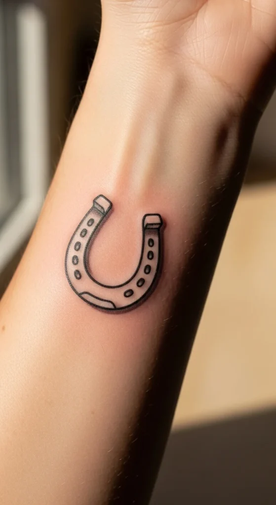 A simple horseshoe tattoo feels warm and symbolic. Many choose it as a charm-style design to remind themselves of better days ahead. Place it upright for a classic meaning or tilt it slightly for a more relaxed feel. Start by drawing several curved shapes on paper to explore spacing. You can keep the line work clean or add small decorative dots to mimic metal. A wrist placement makes it easy to glance at throughout the day. If you prefer something discreet, choose a very thin needle effect. You don’t need extra details for this design to feel complete; the shape alone delivers a positive vibe. Try testing placement with temporary tattoo paper before booking an appointment.