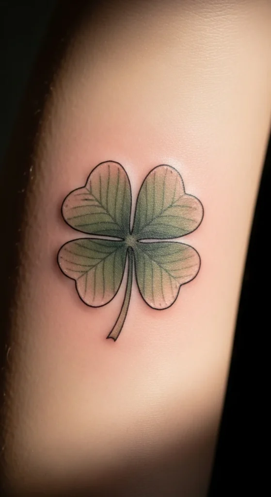 A four-leaf clover tattoo is an easy symbol of luck. Shading adds depth without making the design heavy. Many people choose a soft gradient to keep the tattoo smooth and lightweight. Try sketching leaf shapes with a pencil before deciding on final placement. You can even cut out a paper stencil and tape it on your skin to see how it looks. Small variations in leaf angles make each version unique. For a personal detail, add a tiny initial hidden in one leaf. This idea sits well on the forearm, shoulder, or ankle. It’s low effort but filled with meaning.