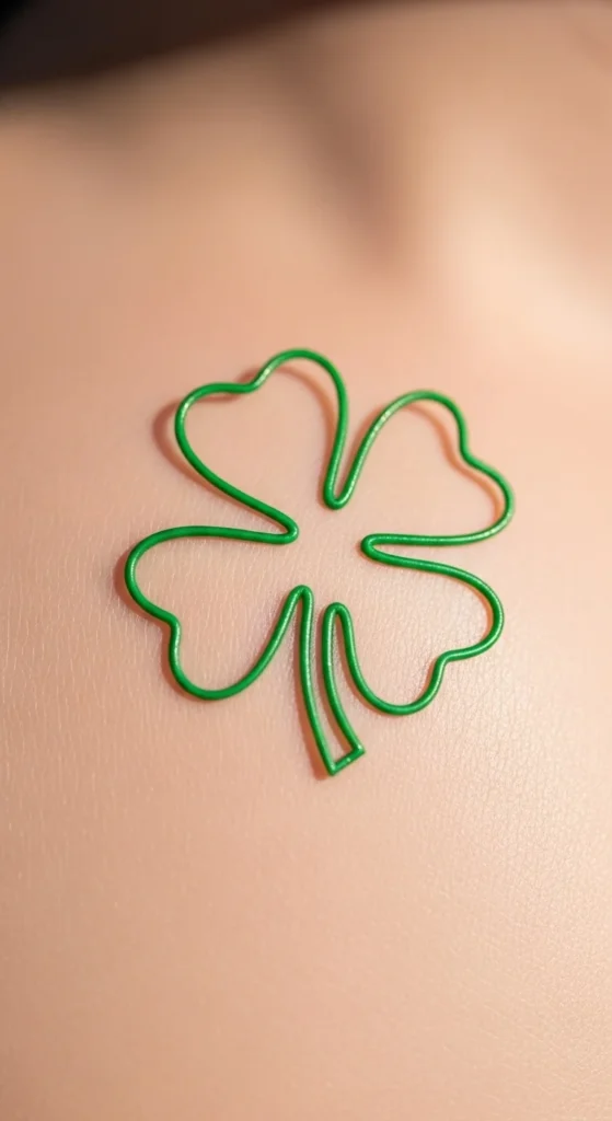 A single-line shamrock feels airy and soft. It’s appealing if you want something light but meaningful. Draw a shamrock using one continuous stroke to practice flow before showing your artist. This design fits well on thin areas like the ribcage or inner arm. The green line adds just enough color to make it stand out without feeling flashy. If you want more control over placement, print a few sizes on regular paper and tape them where you’re thinking. This tattoo is easy to complete and kind to your budget.