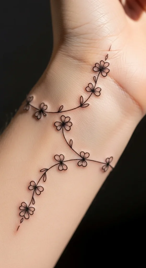 A clover vine bracelet tattoo looks delicate and kind. The wrap-around style creates a soft decorative feel. Start by drawing a thin line to mimic a bracelet, then add tiny clover leaves in even spacing. Trial this design using a washable pen so you can adjust curves easily. The wrist or ankle works best for this idea. You can choose light green shading or keep everything in black line work. It’s a flexible design that suits anyone who likes jewelry-style tattoos.