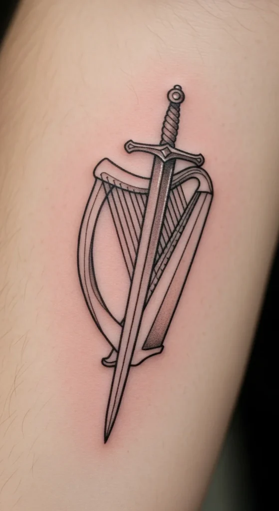 This fusion design combines two strong Irish icons. The frame of the harp pairs nicely with a straight blade. You can keep the harp outline thin to avoid a crowded look. This works well for medium placements like the bicep or thigh. To test the look at home, overlay sword and harp outlines on tracing paper. Light shading helps separate the shapes while staying affordable.