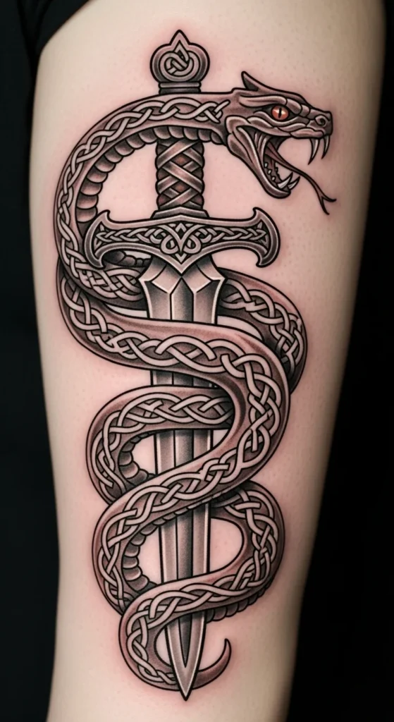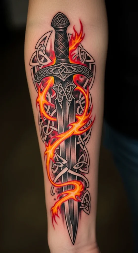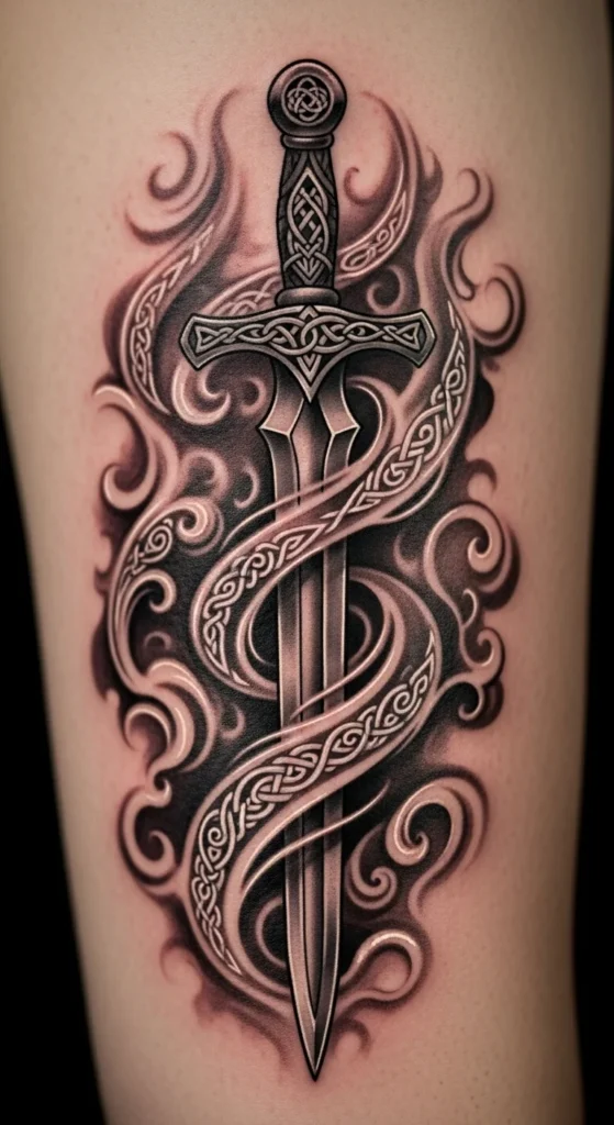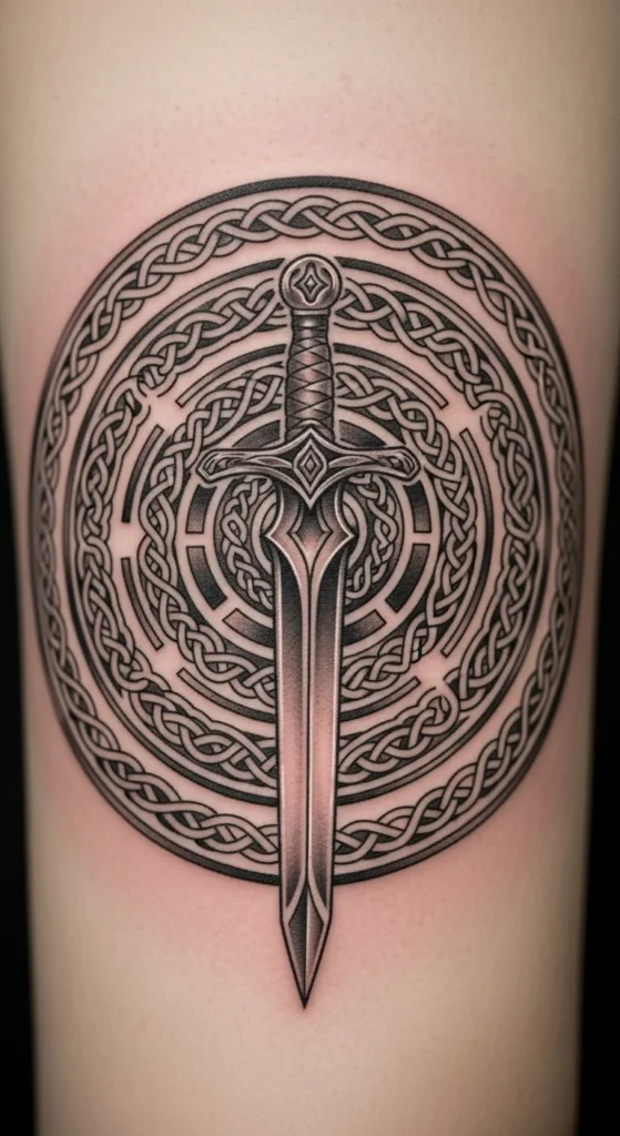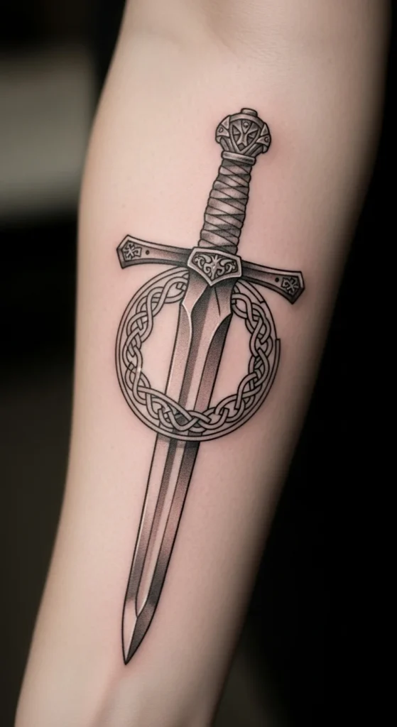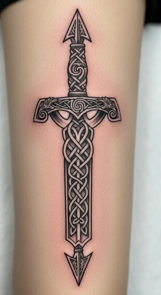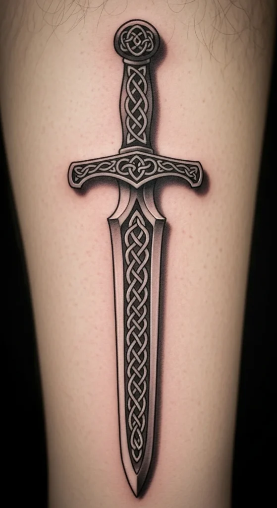 This design suits anyone drawn to simple, structured lines. The knotwork adds movement while the straight blade keeps the layout clean. It works well on the forearm or calf where long shapes sit naturally. If you want to try sketching variations, print a blank sword outline and test knot patterns with a pencil. Keep the costs low by choosing a single-needle style or light shading instead of heavy fills. Talk with your artist about line thickness so the design stays readable over time. You can simplify the knots if you prefer something lighter. This idea grows easily into a larger Celtic theme later.