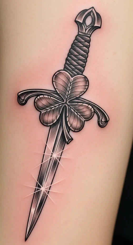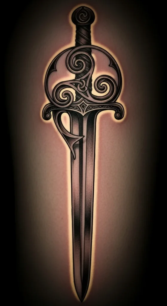 This concept blends motion with strength. The triskelion symbol brings a spiraled rhythm that balances the straight blade. It fits nicely on the upper arm or between the shoulder blades. You can experiment with pencil curves to find a swirl size that feels right. If you want to keep the price friendly, choose a simple black-and-gray version. For a bit of texture, add subtle shading near the guard. This design works for people who like grounded shapes but still want a touch of flow. Your artist can round or sharpen the lines depending on the mood you prefer.