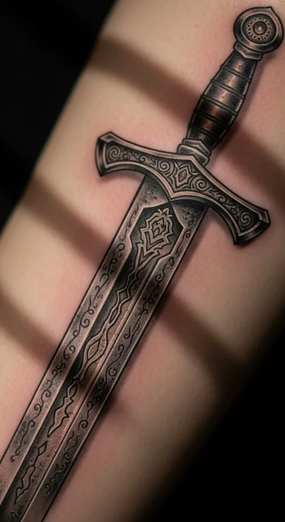 The worn texture gives this design character. It doesn’t require heavy shading; just a few broken lines can make the blade look aged. You can experiment by drawing scratches or marks across a simple sword outline. This design works for the arm or thigh. It also suits people who like pieces that feel lived-in rather than polished.