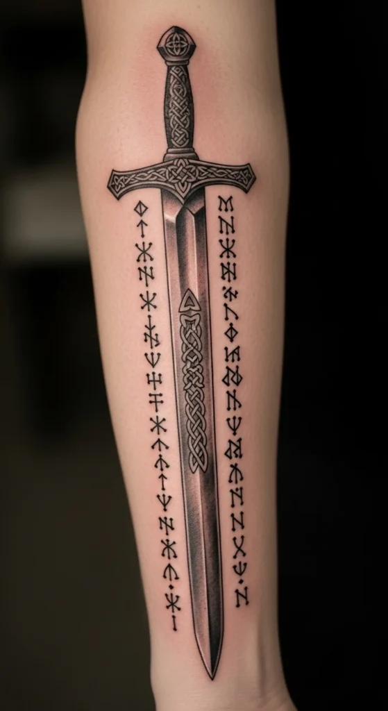Ogham lines match the sword’s vertical flow, making the design tidy and readable. You can look up simple Ogham letters and draw them with straight strokes. The placement works for the forearm, ribs, or thigh. Since the script uses clean lines, this idea stays affordable. Keep the blade shape simple to maintain balance.
