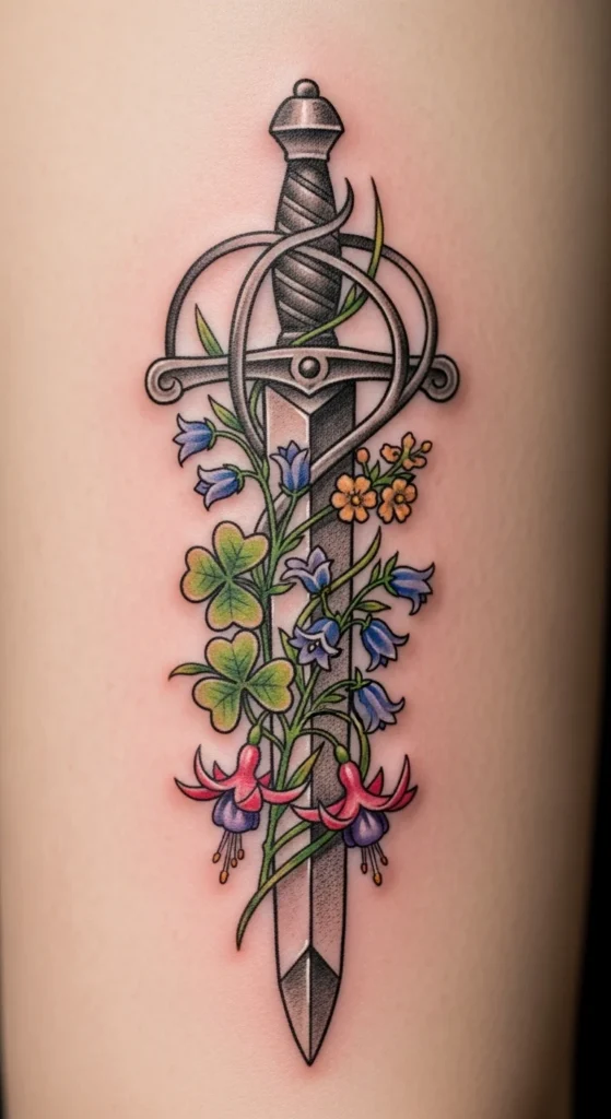 Floral touches give the sword a softer personality without reducing its strength. You can choose small flowers like primrose or bell-shaped blooms. Try sketching them lightly next to a sword outline to see spacing. This design works well on the thigh, forearm, or calf. Light shading keeps the look gentle and the cost low.