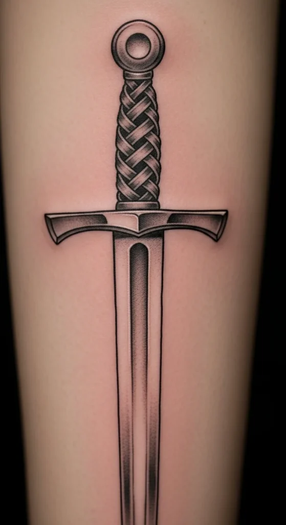The braided handle gives this piece tactile charm. Even in simple ink, the pattern adds a handmade feel. It fits well on the forearm, ribcage, or outer thigh. You can practice the look by drawing interwoven bands on scrap paper. For a budget-friendly version, keep shading minimal and let the linework capture the texture. This sword pairs well with small accents like dots or short knot motifs. If you want a stronger presence, extend the blade length slightly. The straightforward layout works for both small and mid-size tattoos.