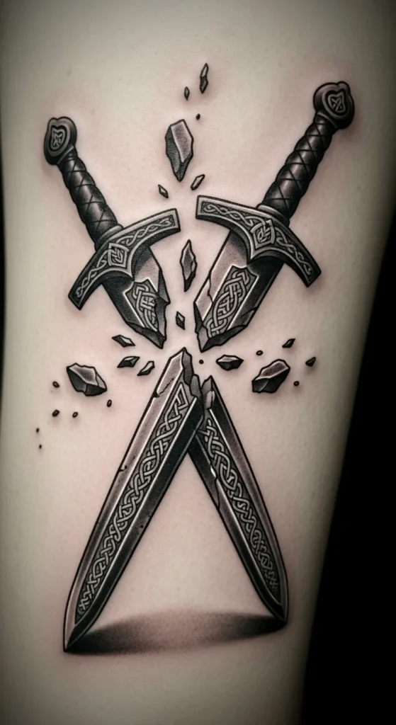A broken sword can represent personal change, endings, or a hard-won moment. The design stays simple while holding emotional weight. You can place it on the upper arm, chest, or behind the shoulder. Sketch a straight sword and draw a clean break to explore shapes that feel right. Add small rune marks for extra detail without driving up the cost. Light shading under the fragments helps create lift. This style suits anyone who wants a story without layers of heavy art.