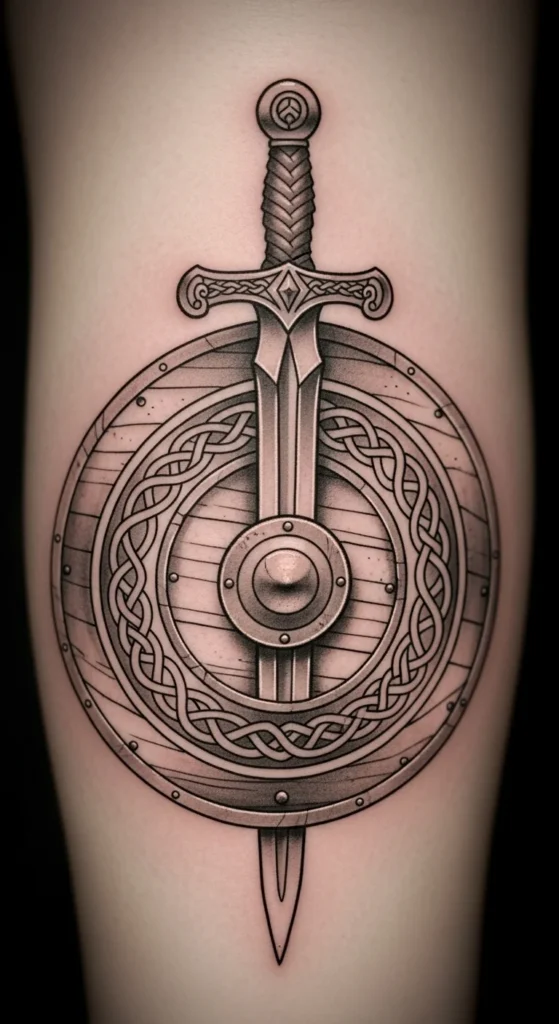 This design adds a sense of action without being busy. The round shield keeps the composition centered, making it great for the upper arm or shoulder. You can make a cheap paper mock-up by cutting a circle and sliding a pencil “blade” through it to test proportions. For a cleaner look, keep the knot lines bold instead of detailed. Black-and-gray shading works well and stays friendly to the wallet. The symbolism leans toward strength, protection, and personal boundaries.