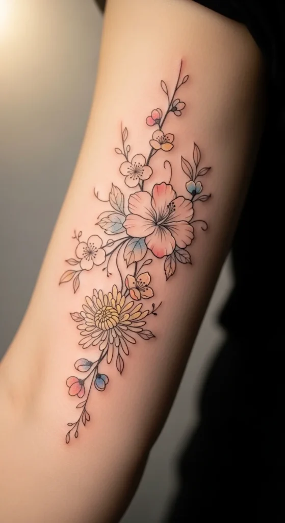 Cherry blossoms show the short, beautiful moments of life. Many people choose them for a thoughtful and gentle look. You can start with a single blossom or create a curved branch that fits the collarbone or wrist. If you want an inexpensive way to preview the flowers, draw three small blooms and scan them into a phone app to resize. This helps you find the right spacing. A balanced layout keeps the design feeling airy. If you want color, soft pink watercolor touches look nice but stay light so they age well.