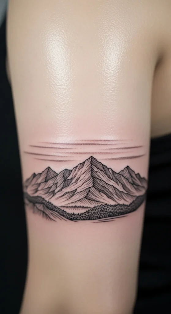 A single-line mountain feels calm and symbolic. Korean-style peaks have gentle curves and simple outlines. You can draw a soft “M” shape and smooth the lines until it looks natural. This tattoo works well on the forearm or wrist. To preview it, cut out the line shape and tape it in place. Keeping the line smooth is the key. If you want a quiet touch, add a small moon above the peak.