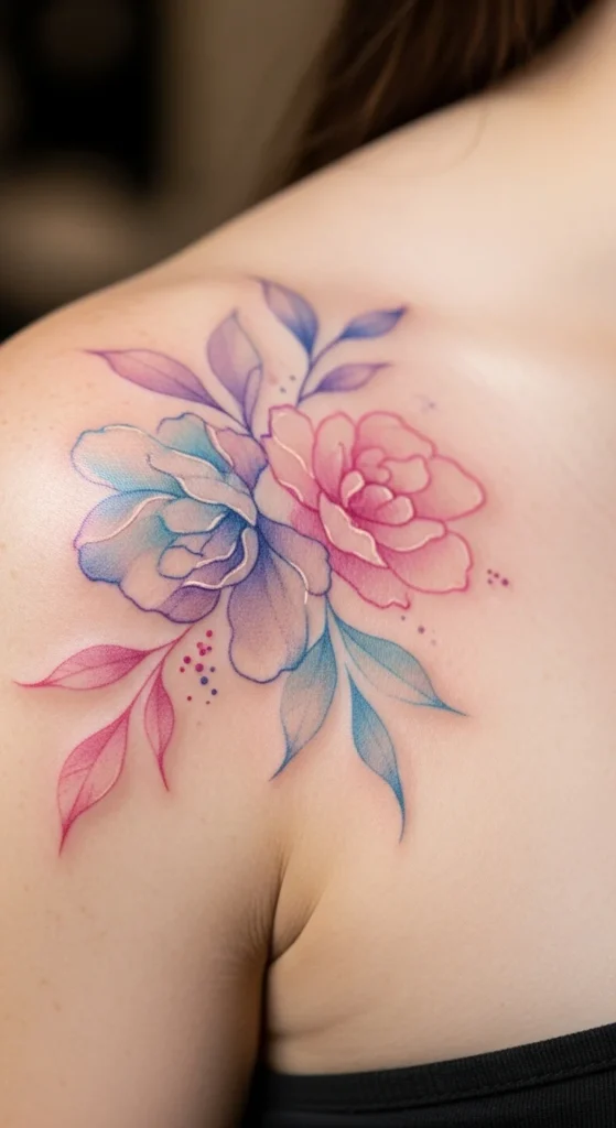 Watercolor tattoos add a gentle touch without looking heavy. Korean-style watercolor stays light and airy with soft pinks, purples, or blues. To keep it budget-friendly, test color placement with watercolor pencils on tracing paper before choosing final tones. Avoid large patches of color so the design stays subtle over time. A small bloom on the shoulder or ankle works nicely. Adding a thin outline helps the piece keep its shape.