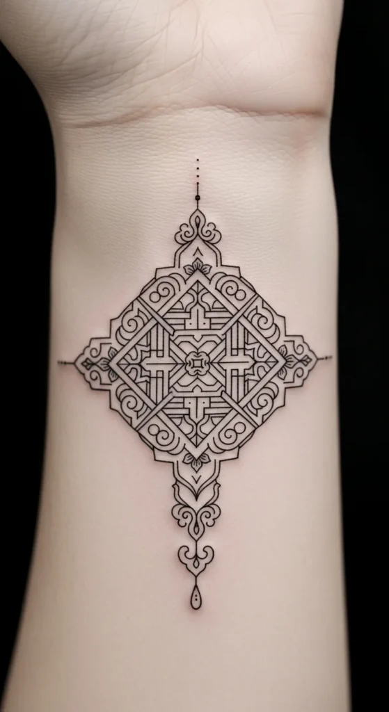 Dancheong patterns come from Korean architectural painting. Using only a few shapes keeps the design from feeling too bold. A small diamond with petal-like edges or a single repeating circle makes a nice motif. To design at home, study a dancheong reference and outline just the core shape. This tattoo works well on the wrist or behind the ear. Keep spacing even so the pattern stays tidy.
