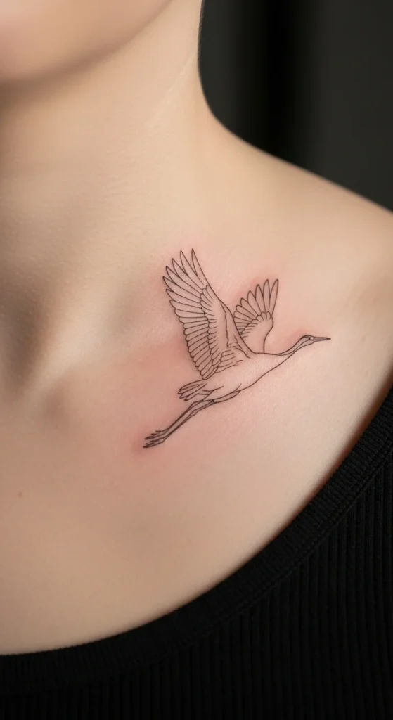 Cranes symbolize long life and grace. A simple crane flying or standing adds a light, reflective feel. Use a single-line outline for the wings and a clean beak shape. To DIY a test version, trace a crane photo and remove extra detail. This keeps the tattoo from looking cluttered in small size. Works beautifully near the collarbone or wrist. If you like movement, angle the crane slightly upward.