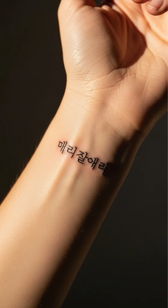 Hangul script works nicely for short words like 사랑 (love) or 용기 (courage). These tattoos are small, meaningful, and easy to personalize. If you’re unsure about translation, compare two or three verified sources before choosing the final spelling. You can even print the script in different sizes to test visibility on your arm or collarbone. If you’re designing on a budget, trace Hangul characters from a reliable chart and adjust spacing until they look balanced. Try placements like the forearm, rib side, or wrist for something clean and subtle. Keep the characters spaced evenly so each stroke stays readable over time.