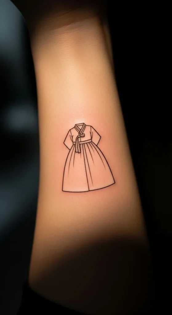 A tiny hanbok outline honors Korean heritage with a soft, modern twist. Focus on the curved jeogori top and the gentle lines of the skirt. Avoid heavy folds or shading. To test at home, draw the outline and remove any internal detail that feels crowded. Try placements like the arm, ankle, or upper back. It pairs well with a small flower or star.