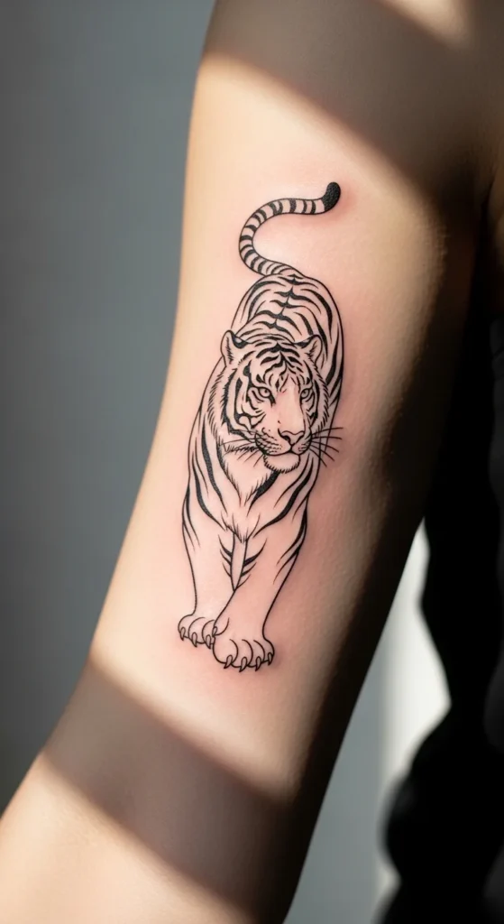 The Korean tiger represents courage and good fortune. Even in tiny form, it feels bold without being loud. Many people choose a simplified tiger head drawn with soft lines or minimal shading. To test how bold you want it, draw a basic oval, add soft stripes, then reduce the number of lines until it feels clean. This keeps the tattoo from looking crowded. If you like symbolic placements, try the shoulder, ankle, or upper arm. For something more personal, combine the tiger with a small flower or a Hangul word underneath. Temporary tattoo paper helps you preview the size before committing.