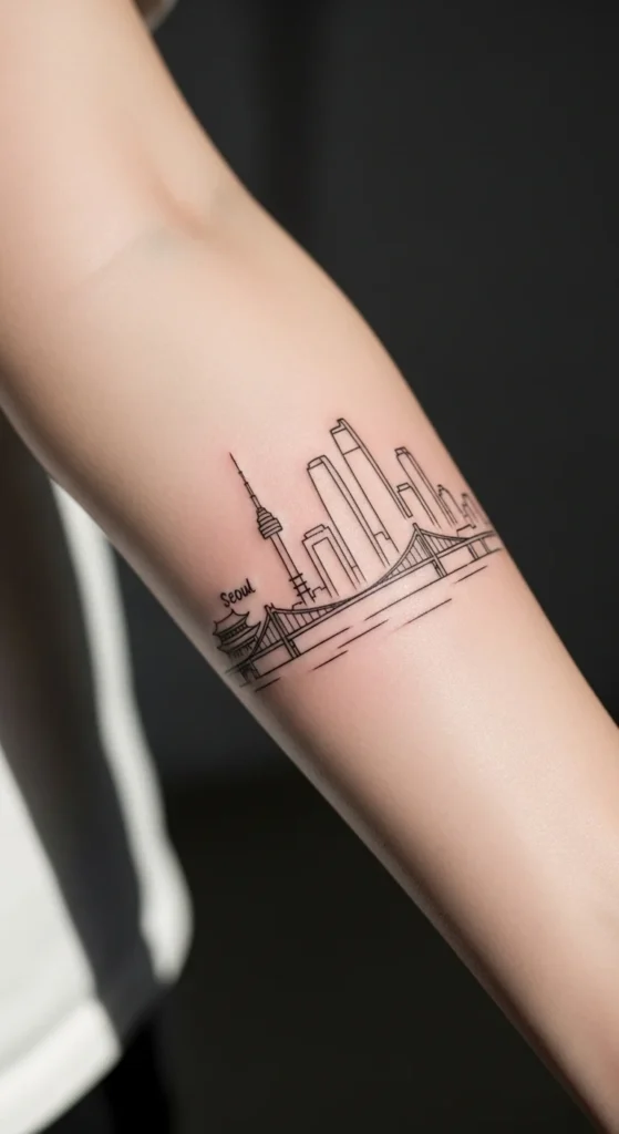 A simple skyline of Seoul can feel personal if you love the city or its culture. A minimal single-stroke outline works well because it stays clean and doesn’t overwhelm small areas. You can trace a skyline photo and simplify it until only essential shapes remain. Try it along the wrist, forearm, or upper back. If you want to test placement, cut out the paper outline and tape it in different spots. Keeping the line smooth and even is the key to making the silhouette look polished.