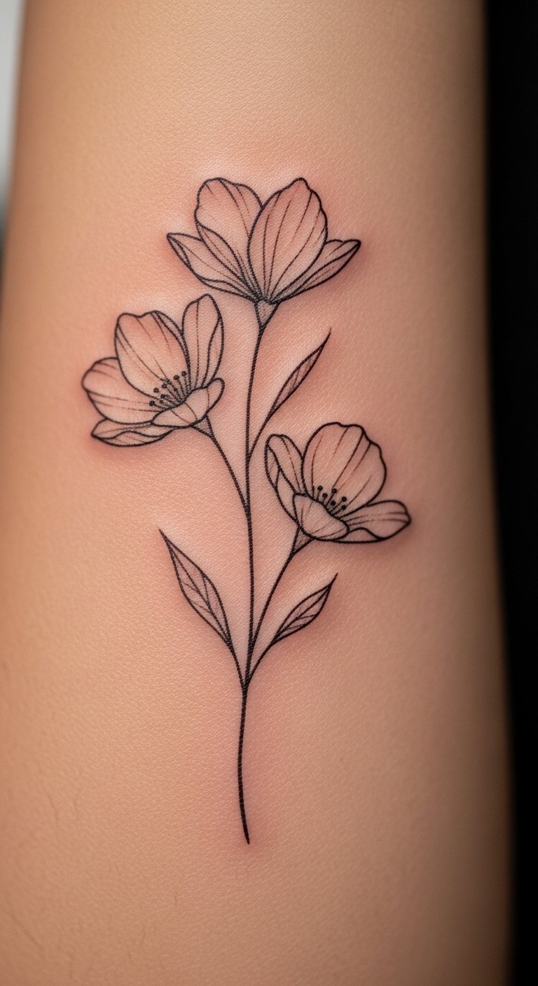I love this for how subtle and timeless it reads. Fine line florals use single-needle linework to capture petal edges and vein details without heavy fill. Inner forearm placement lets the design breathe with your arm’s natural curve; it’s low pain and heals predictably. Expect surface healing in a couple of weeks and full settling by 3 months — lines can soften slightly but still read crisp if ink depth was right. Common mistakes: asking for lines that are too thin for high-motion zones (wrists, fingers) — match line weight to the area. Ask the artist for healed photos and mention “fine line floral” and “single needle” during consultation.