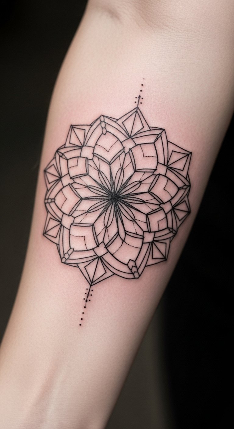 Geometric mandalas thrive on precise linework and consistent spacing. Outer forearm suits this because it’s relatively flat, so lines land straight and age evenly. This is a place where lineweight matters: mix thin decorative lines with slightly bolder anchors to help the pattern hold over time. Pain is moderate; the outer forearm is forgiving. Healing requires careful sun protection—negative space and black line contrast are what keep the design modern-looking. Avoid over-detailing tiny segments that will blur; instead use repeating motifs and ask for “geometric line tattoo” and varying line weights.