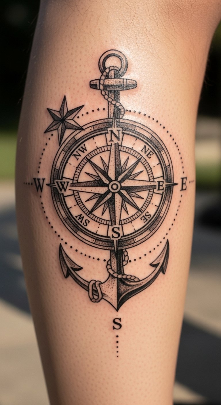 Etching-style uses cross-hatching instead of smooth shading to create depth while keeping the line aesthetic. The calf’s thicker, steady skin is ideal for this technique. It ages well because heavier anchor lines resist blur and the hatched detail reads as texture even as fine points soften. Pain is tolerable; calf sessions are comfortable compared to ribs. Don’t overdo micro-hatching in very small areas — it can become a muddy patch later. Use terms like “etching linework” and “compass tattoo” when discussing depth and negative-space balance.
