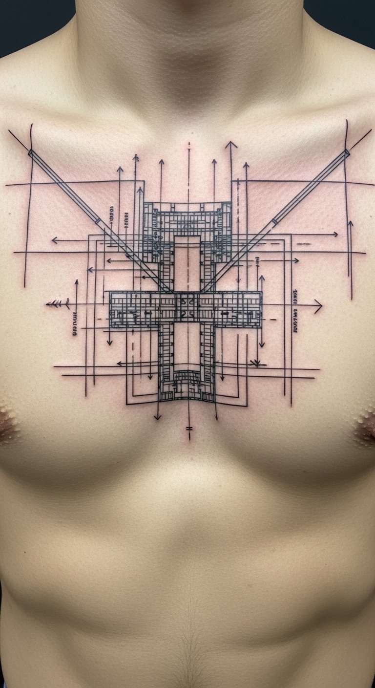 Blueprint linework translates cityscapes or building plans into the body, favoring straight, confident lines. The sternum and chest present curvature that suits architectural composition but can be painful and needs multiple sessions. Use heavier primary lines for longevity and reserve tiny hatch details where movement is minimal. The look is modern and masculine but also graphic and clean. Avoid hyper-fine grids over high-motion skin. Mention “blueprint linework” and “architectural tattoo” so the artist plans line weights and negative space strategically.