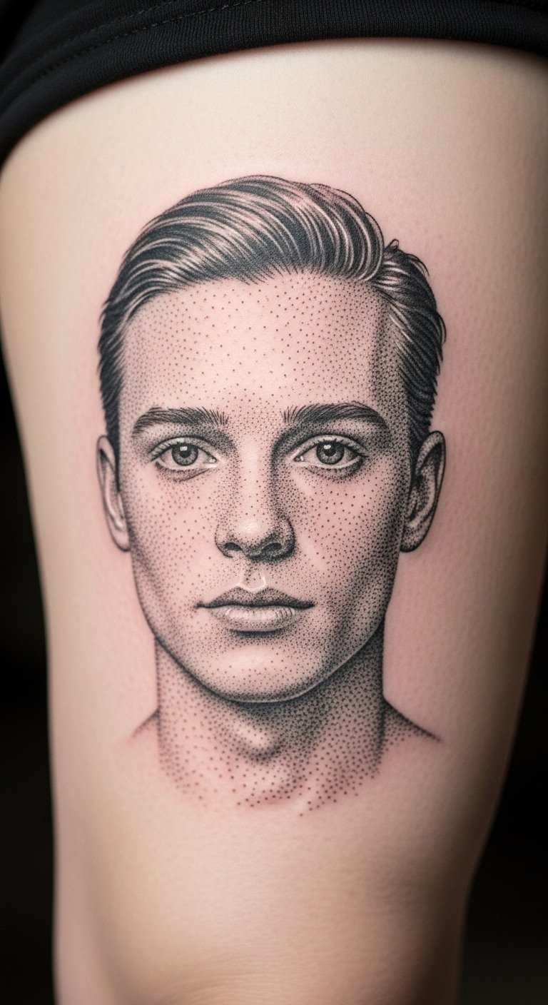 Micro-realism puts photo-like detail into a small scale using delicate line texture and dot work. The thigh’s generous canvas and thicker skin are ideal for this; it’s less painful and heals well. Because it uses fine-line texture rather than heavy shading, the piece holds character as lines soften. The risk is asking for too much detail in too small an area — facial features need space. Use “micro-realism” and “fine line portrait” so the artist plans adequate scale and layering.