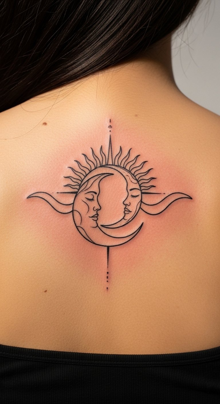 Sun and moon line art reads like a minimal emblem of balance. The upper back is a forgiving canvas for slightly wider compositions and varying line thickness. This placement sees less daily abrasion, so thin lines can fare well here. Healing is straightforward, but prolonged sun exposure on the back while out in summer is a fading risk — sunscreen helps maintain contrast. Mention “line art” and “minimalist celestial” to guide the artist’s approach to negative space.