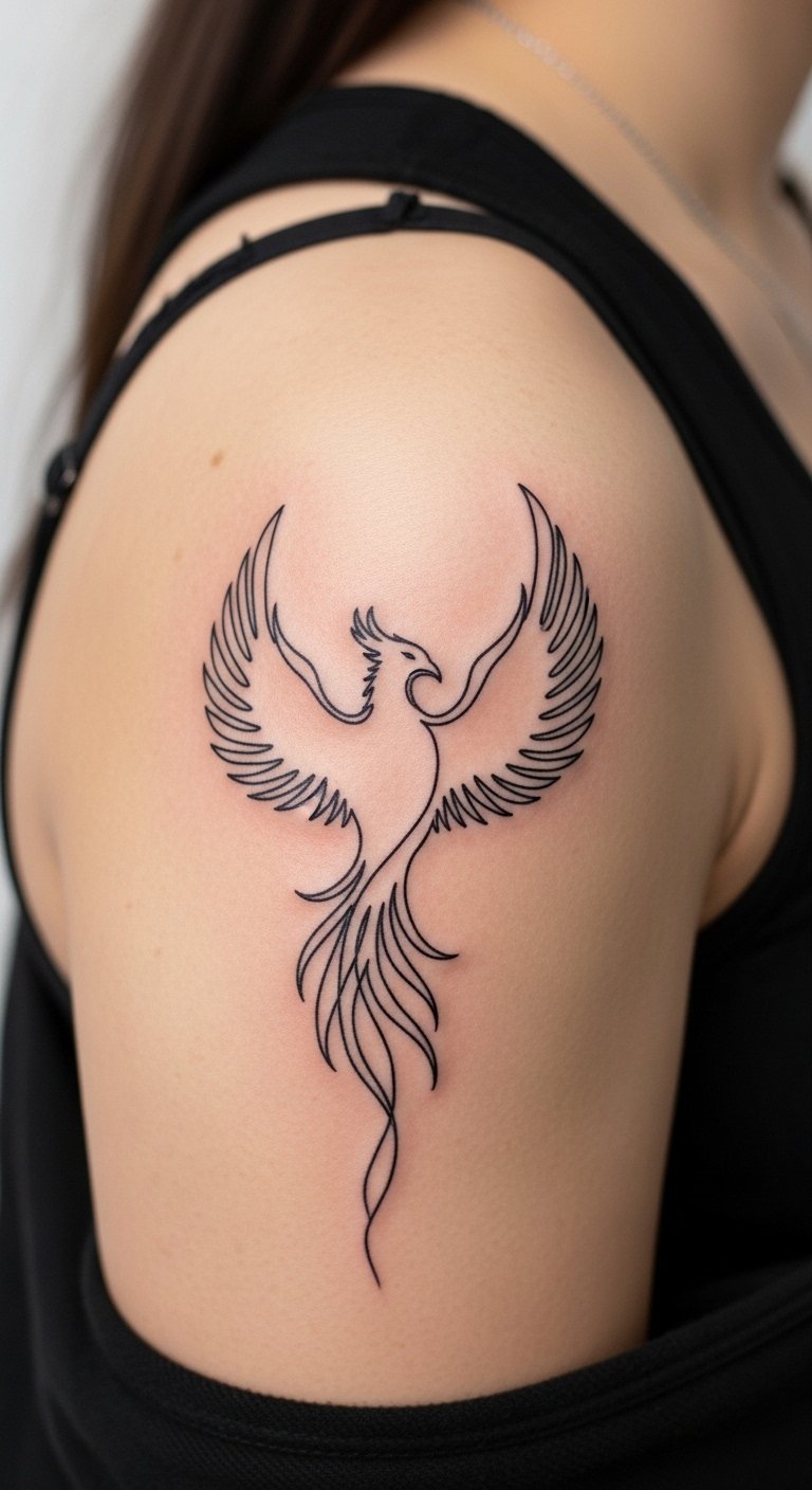 A continuous-line phoenix is dramatic while staying modern. Shoulders provide a rounded surface that showcases sweeping lines. Because it’s a mythic silhouette rather than heavy shading, it ages well — the main lines anchor the shape even if tiny details soften. Shoulder sessions are tolerable; larger scale may need multiple visits. Avoid cramming small feather details into tiny areas. Use “continuous line” and “mythical silhouette” when briefing your artist.
