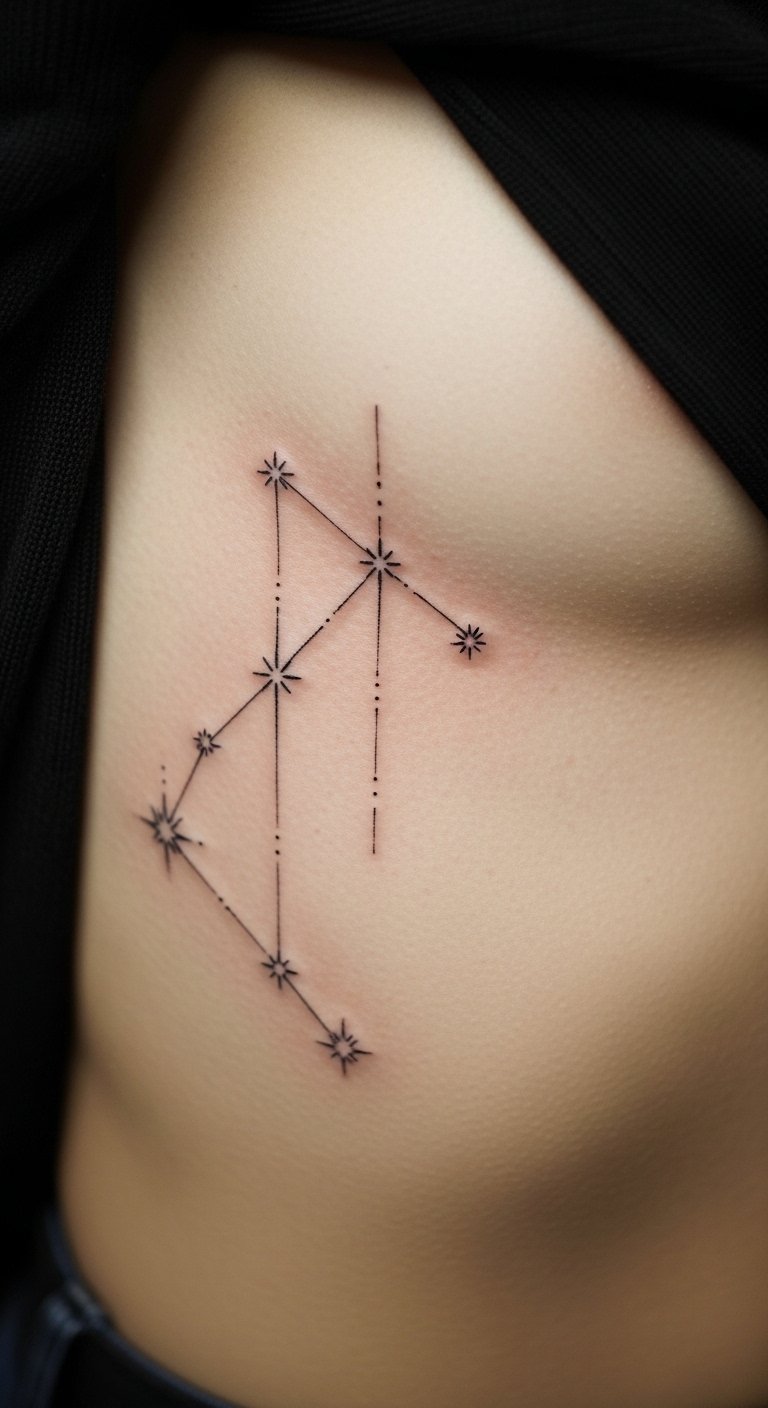 Ribcage pieces are intimate and high on the pain scale, but they can be worth it for the subtle curve and concealability. Fine-line constellations use tiny dots and connecting strokes; on ribs, choose a slightly bolder main axis so it doesn’t blur into a smudge over time. Healing is slower because of movement and stretch; expect tenderness. Common mistake: too many micro-stars in a small area — give each element room. Mention “fine line” and “geometric constellation” to ensure proper spacing.