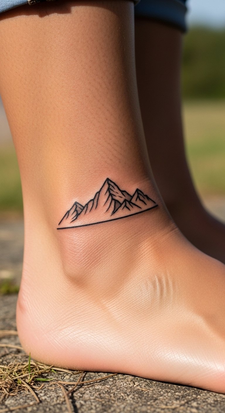 A minimalist mountain range reads like a tiny horizon at rest. Ankle placement shows movement and can wrap slightly, playing with perspective. Keep lines bold enough to remain legible as skin moves. Healing needs protection from shoes. The common mistake is excessive tiny detail on a small ankle canvas; stick to clear silhouettes. Use “minimalist” and “linework tattoo designs” in your brief so the artist knows to favor clarity.