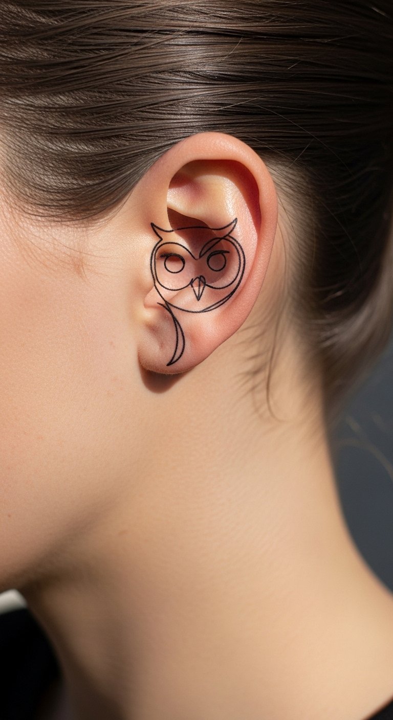Behind-the-ear tattoos are small and intimate; single-line owls work well here because the shape reads clearly even tiny. Expect more sensitivity in this area. Lines should be slightly reinforced so they don’t disappear into ear folds over time. Avoid overly tiny details; strong simple contours travel better. Mention “single line animal” so your artist balances scale with the spot’s anatomy.