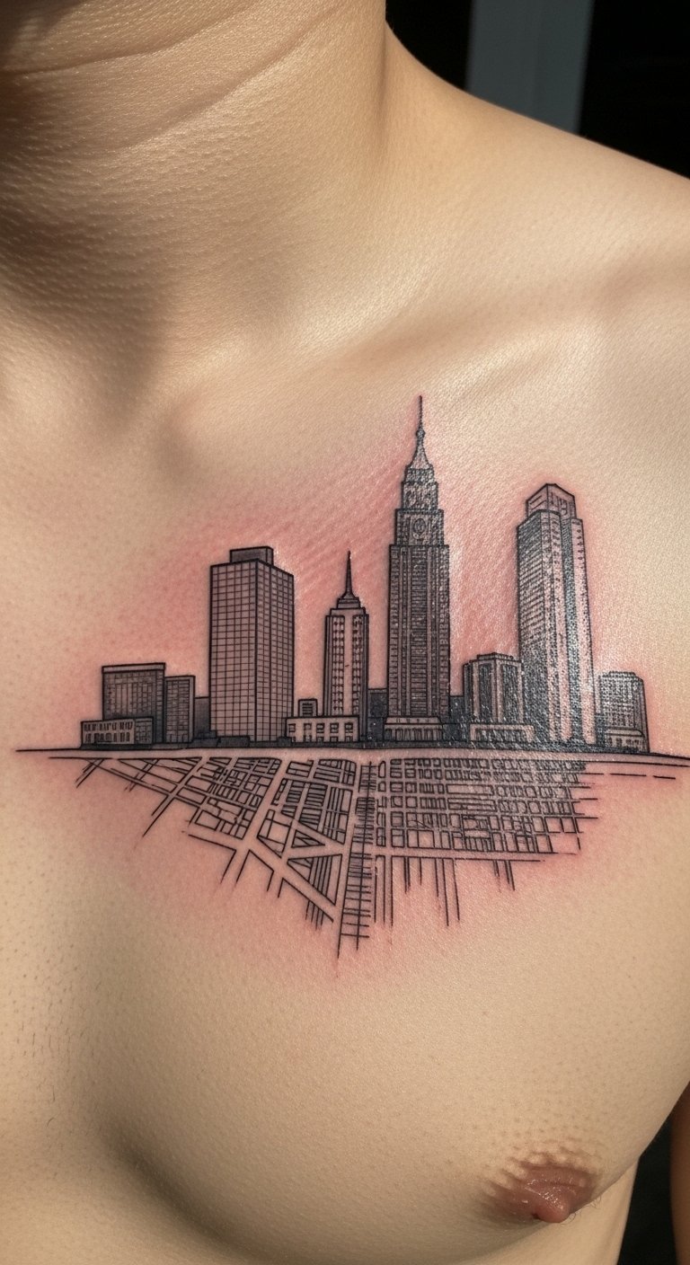 A skyline stitched in blueprint lines becomes a modern wearable map. Chest placement allows horizontal spread; use bolder baseline lines with finer architectural accents. Because the chest shifts with breathing, prioritize structure over micro-detail. Sessions can be broken up; healing takes care with shirts. Avoid ultra-fine hatching across moving areas. Use “architectural blueprint” and “chest cityscape” in your artist brief.