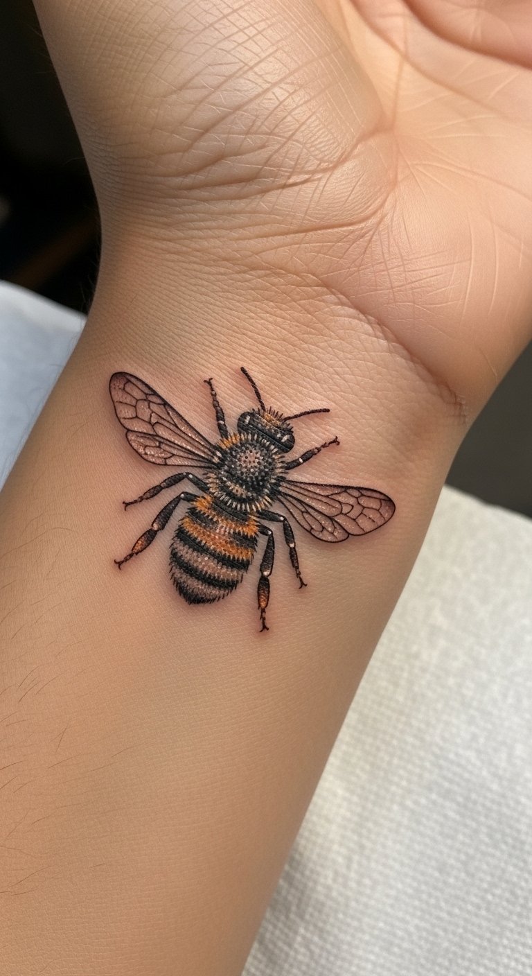 Micro-realism insects are a fresh way to wear tiny realism — a bee or moth that reads like a small photograph. Wrists are visible and move a lot, so scale up slightly to keep details distinct. Healing is quick but protect from constant friction. Main mistake: cramming too much tonal range into a tiny area. Tell your artist “micro-realism” and show reference scale.