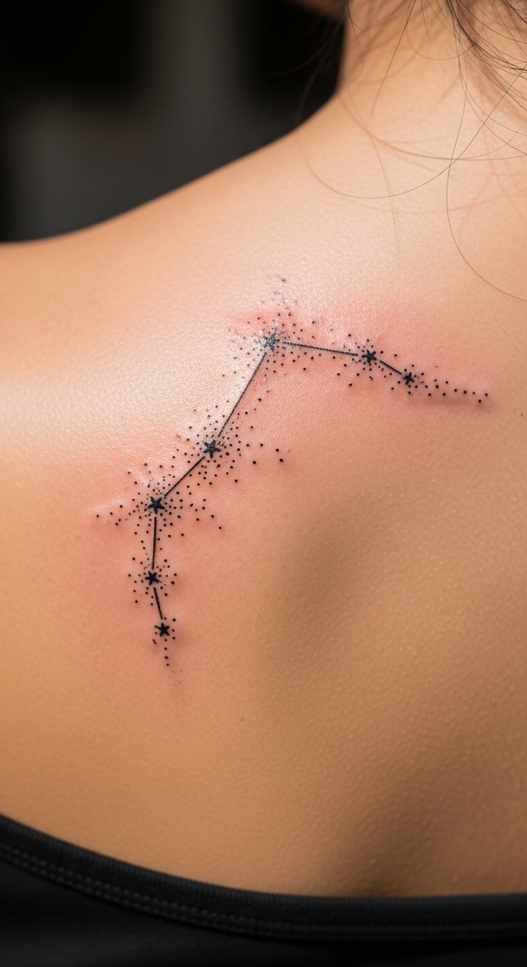 A behind-shoulder constellation is playful and hides under clothing easily. Thin lines and dots work well here because movement is moderate and sun exposure varies. Keep star spacing generous to avoid clustering that blurs. This spot is lower pain and quick to heal. Use “minimalist” and “linework tattoo designs” to guide scale choices.