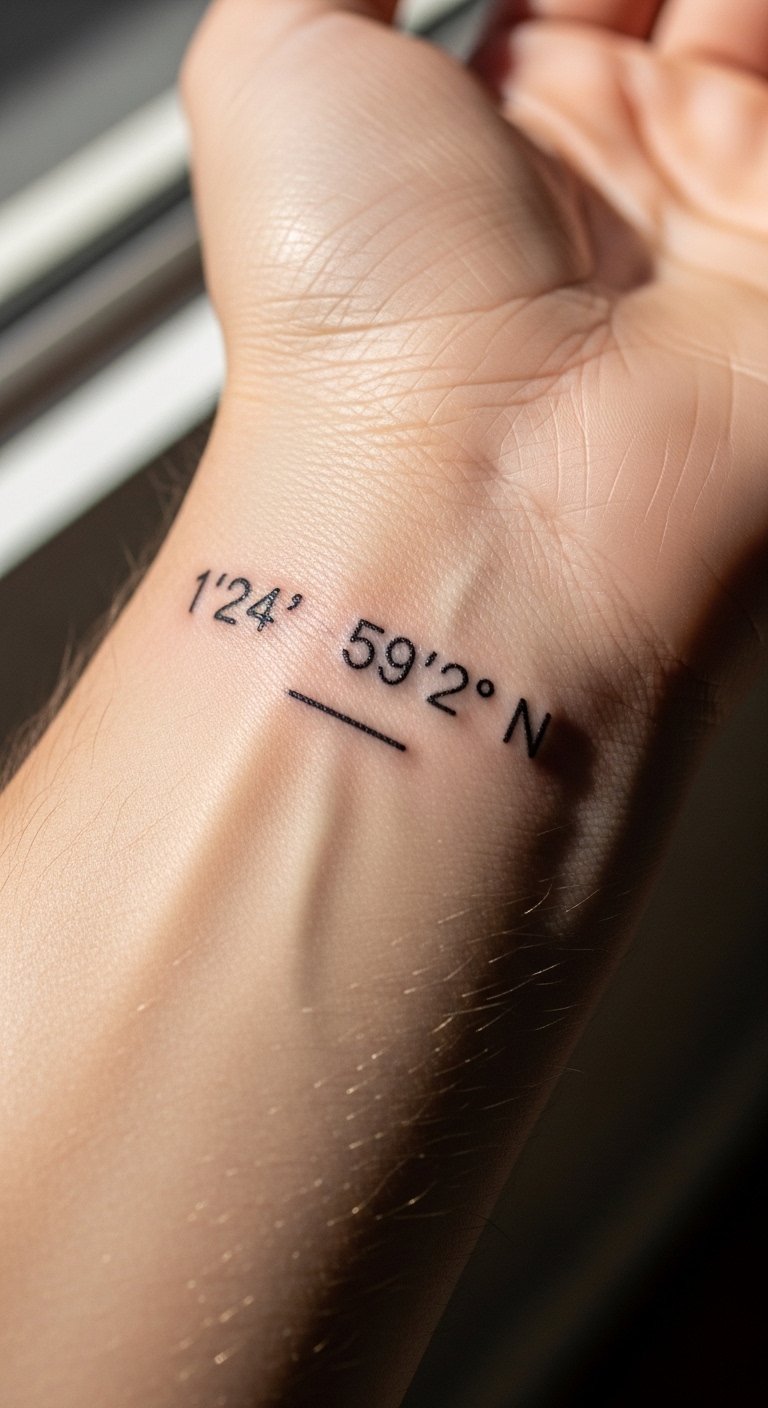 Coordinates are modern, meaningful micro-tattoos. Wrists are visible and wear contact with clothing, so pick a crisp weight for the numerals. Expect surface healing quickly; longevity depends on how bold the digits are. Avoid fonts that are too thin or ornate. Tell your artist “fine line tattoo ideas” and show the exact font scale you want.