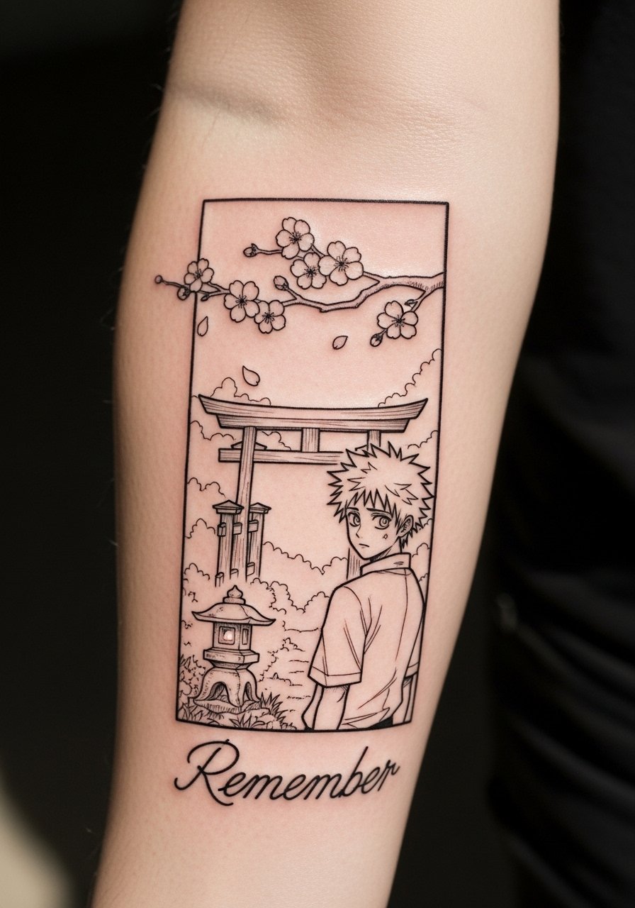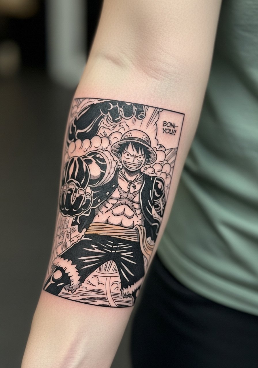 Someone I know chose this forearm panel because it reads from across a room. Forearms are flat and durable, so blackwork illustrative panels do well there. Expect moderate pain and a one to two hour session for a 4 to 6 inch crop. Tell your artist you want thick outlines with varied internal hatching and no micro details that will blur on movement. A common mistake is requesting tiny screentone stippling, which fades into a muddy patch at six months. For long-term maintenance, plan a touch-up at year two for saturation. Use hashtags like #BlackworkAnime to find matching portfolios.