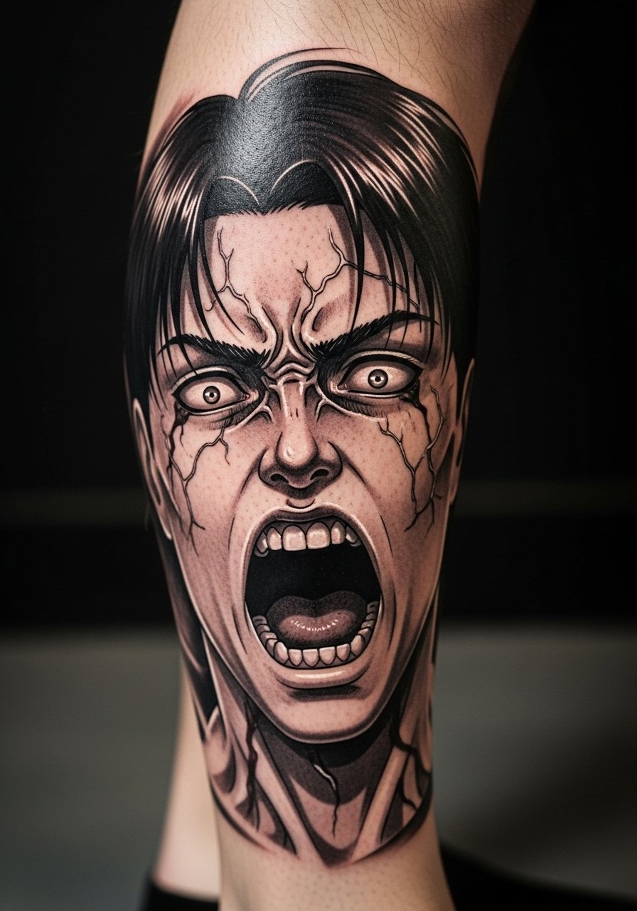 Calf panels suit dramatic, shadow-driven realism. A 6 to 8 inch panel usually needs two sessions. Calf skin is thick and tolerates heavier saturation without blowout, which makes it a good choice for high-contrast emotion panels. During the consult ask for crisp contour linework and deep gray washes behind the mouth and eyes. A frequent error is packing too many tiny teeth or screen tones into a small area. Healed at six months you still see the contrast, at two years expect some softening of the deepest grays. Calf panels pair well with black and gray legs or a full sleeve later.