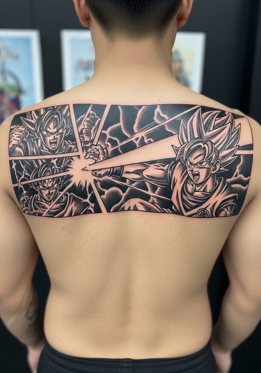 Back panels let you go wide and epic. An 8 to 10 inch wide Kamehameha often requires two to three sessions for heavy blackwork shading. Tell your artist you want strong beam contrast and blocky black silhouettes to keep the motion legible from distance. The biggest mistake is packing in too many small speed lines that muddy on larger, curved surfaces. Back skin handles saturation well, but healing depends on sleeping position and clothing. Expect slower initial healing but durable long-term saturation because of low sun exposure on covered days.