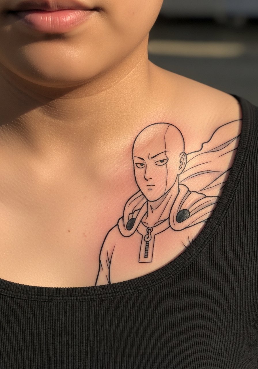 Chest panels can be surprising simple and bold. A 5×6 inch Saitama crop sits well between pecs for an ironic effect. Expect moderate pain and one session for a fine line action panel. A mistake is asking for faint single-needle outlines there without testing because chest skin moves with breathing and can shift thin lines. If you want contrast, ask for slightly thicker contour strokes around the character. The chest also takes sun well if you protect it, but be mindful of shirts rubbing during healing.