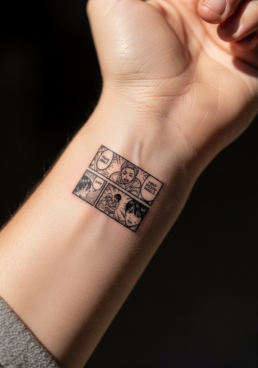 This is a niche idea I saw in one Reddit thread. Scaling a panel to match a phone screen makes the crop feel like a tiny comic pocket. The wrist is high-movement and often fades or blurs within months. Keep the design bold and avoid tiny screentones. A 3 inch panel takes one session but expect touch-ups at year one. The common mistake is copying tiny original line weights which disappear. If you want this location, ask the artist to thicken key contours and to place the art on slightly flatter wrist real estate to reduce distortion from bending.