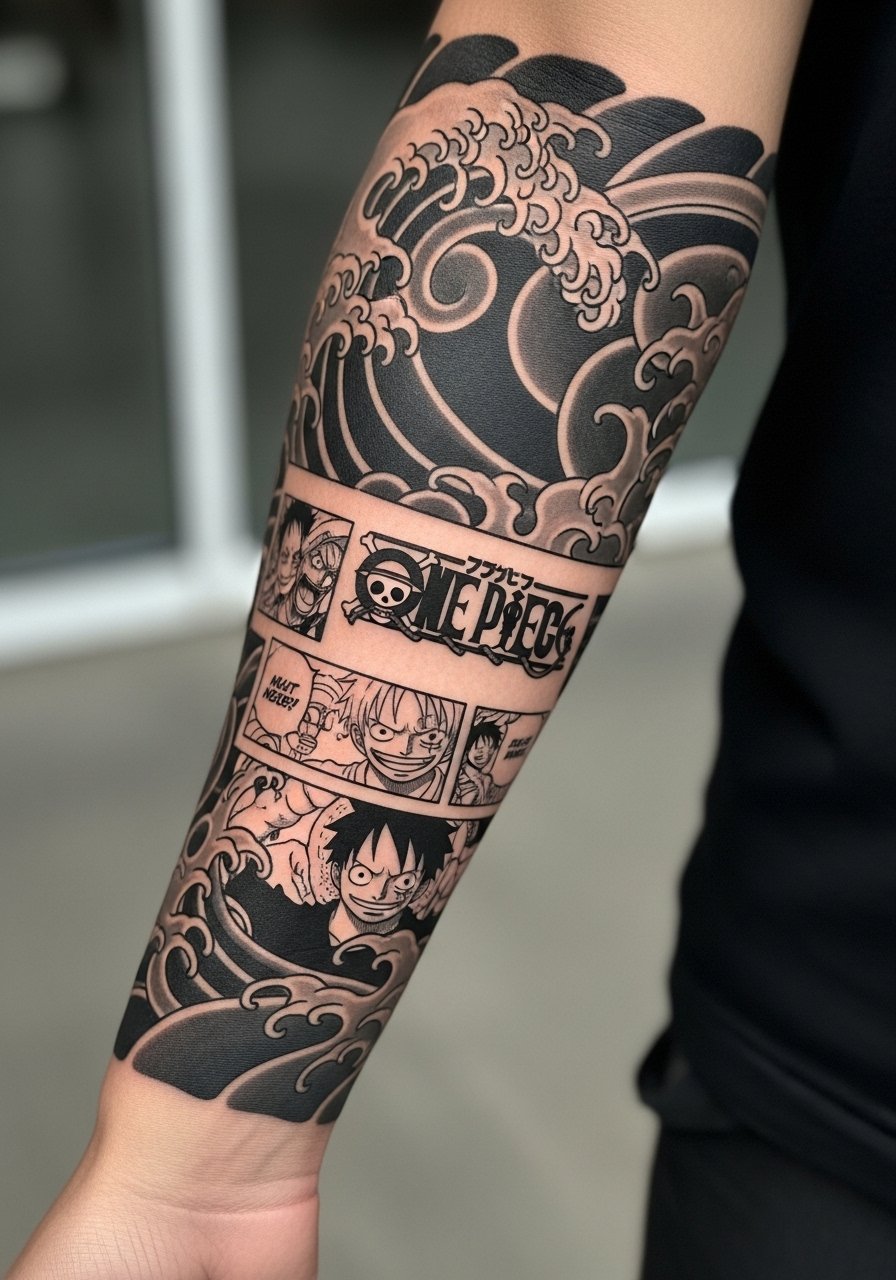 Pairing manga panels with traditional wave motifs tames panel edges and helps flow into sleeves. Forearm pairing works well because the waves guide movement around the arm. When briefing the artist, ask them to adapt wave scale to your anatomy so the panel does not look pasted on. A common error is pasting a panel without transitional elements which makes the piece read like two unrelated tattoos. Respect cultural origins by discussing the wave's stylistic choices rather than copying exact ceremonial motifs. This hybrid approach hides future touch-ups inside the wave texture.