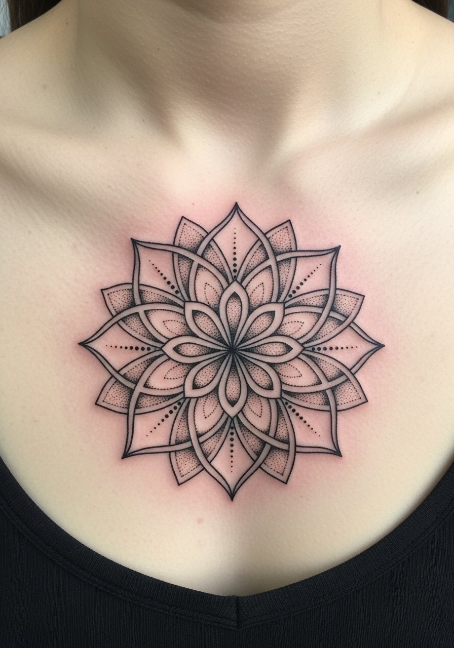 A mandala rendered with screentone-like dots gives a printed-manga feel. The sternum is sensitive; expect pain and heavy aftercare. In my experience, dot gradients hold well when artists space dots progressively. Avoid overly dense center dots that can turn into patches. This style pairs well with thin surrounding linework to frame the mandala.