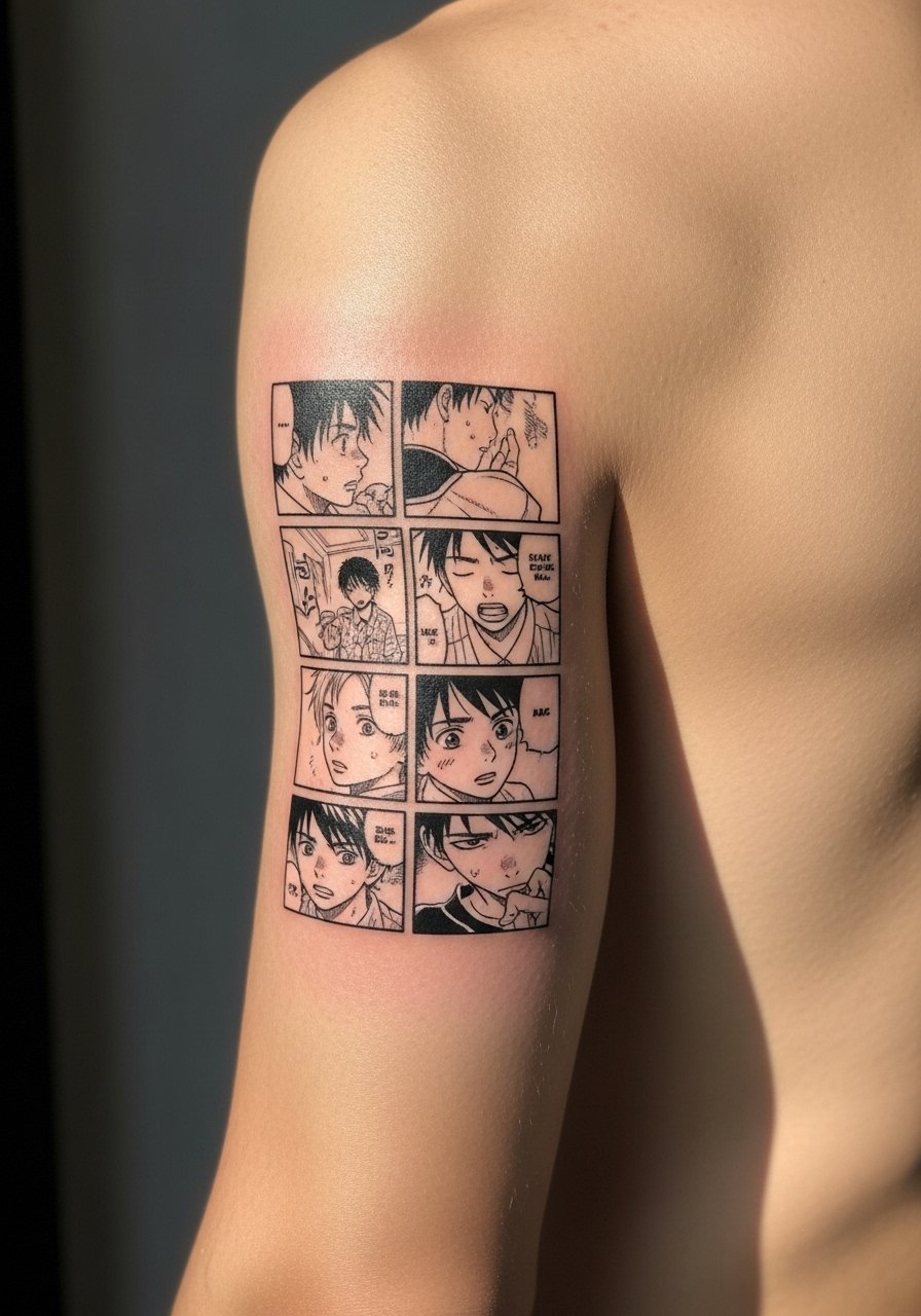 A panel sleeve mimics comic layout. Bold borders and large black shapes help the composition read from a distance. I’ve seen this layout hold up well because strong black anchors resist fading. Forearm placement moves with your arm but offers a flatter surface than the inner elbow. Expect several sessions. Pain is manageable but can spike near the wrist. For longevity, ask for clean negative-space gutters between panels—this prevents ink merging over time. Avoid tiny, unreadable panels; fewer, larger panels keep narratives legible once healed. Artists who understand screentone halftoneing will reproduce that printed texture beautifully.