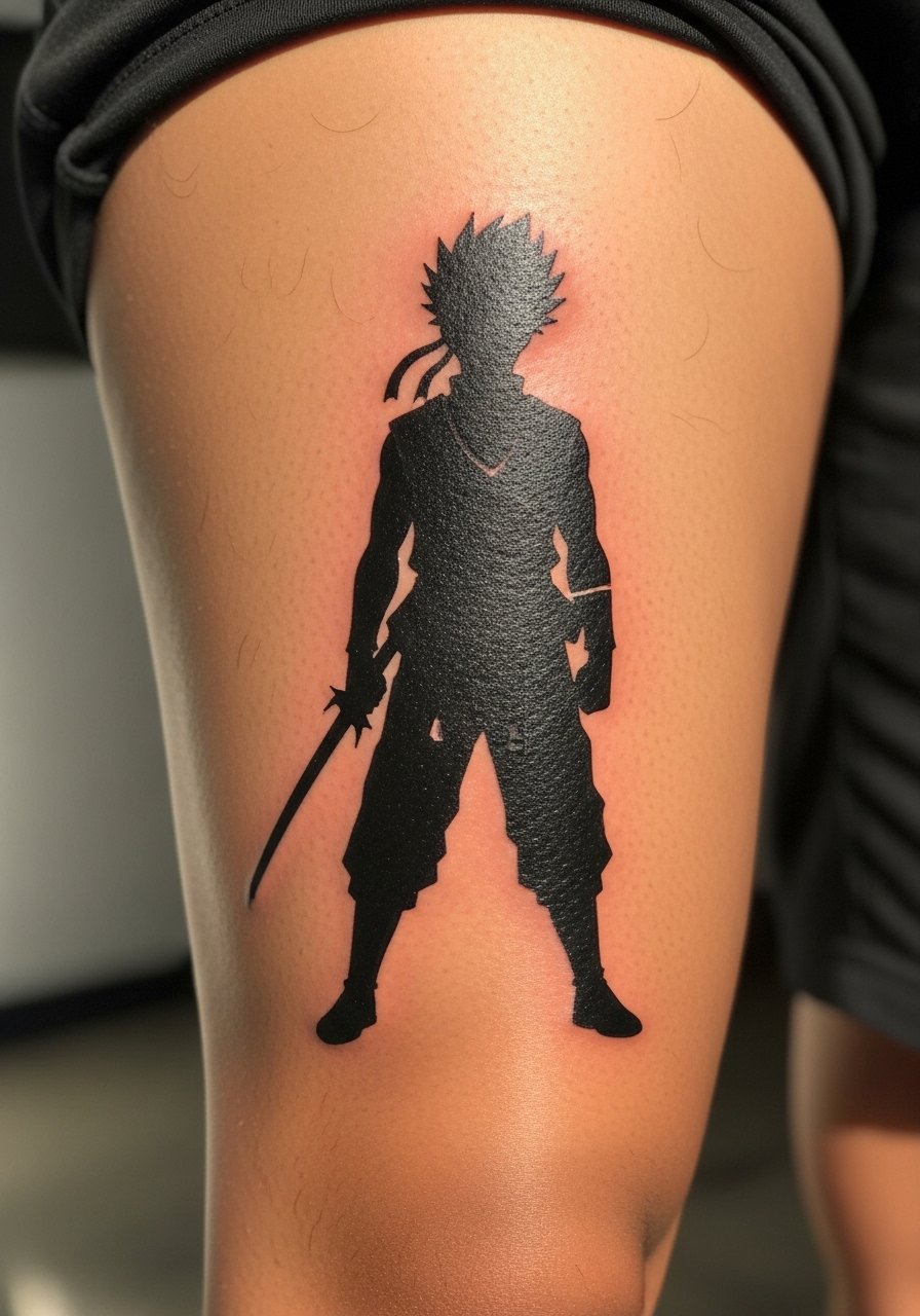 Silhouettes are forgiving. Solid black areas age predictably and demand less touch-up than fine detail. The thigh is comfortable for both sessions and healing. From what I’ve seen, avoid tiny inner details inside silhouettes; they’ll disappear over time. This is a good option if you want a manga shape that stays strong.
