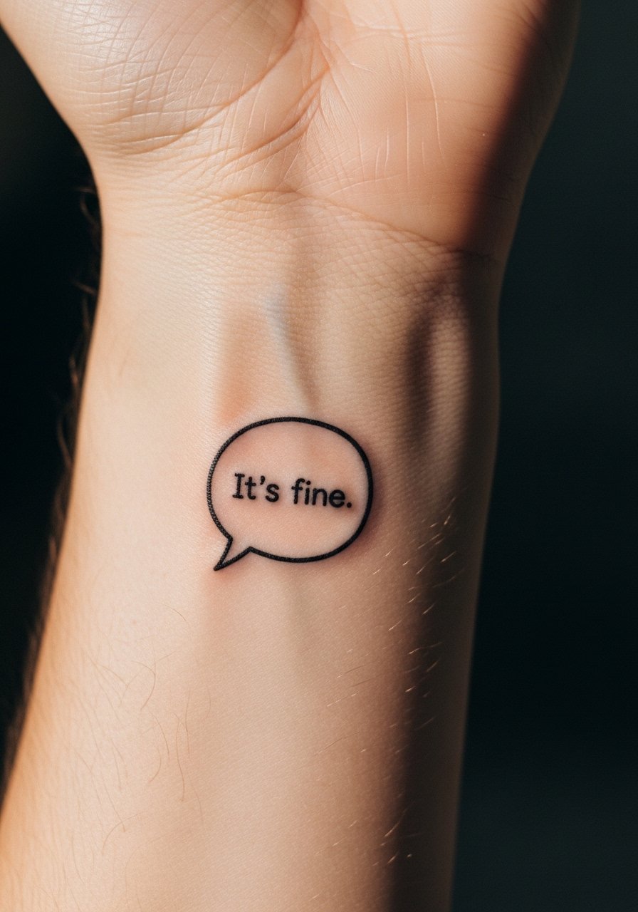 Speech bubbles feel playful and direct. Inner wrist placement is visible and meaningful but exposed to sun. From my experience, keep text short and bold so it stays readable as ink settles. Protect this area from constant friction during healing. Avoid tiny script fonts; choose block or simple handwritten styles.