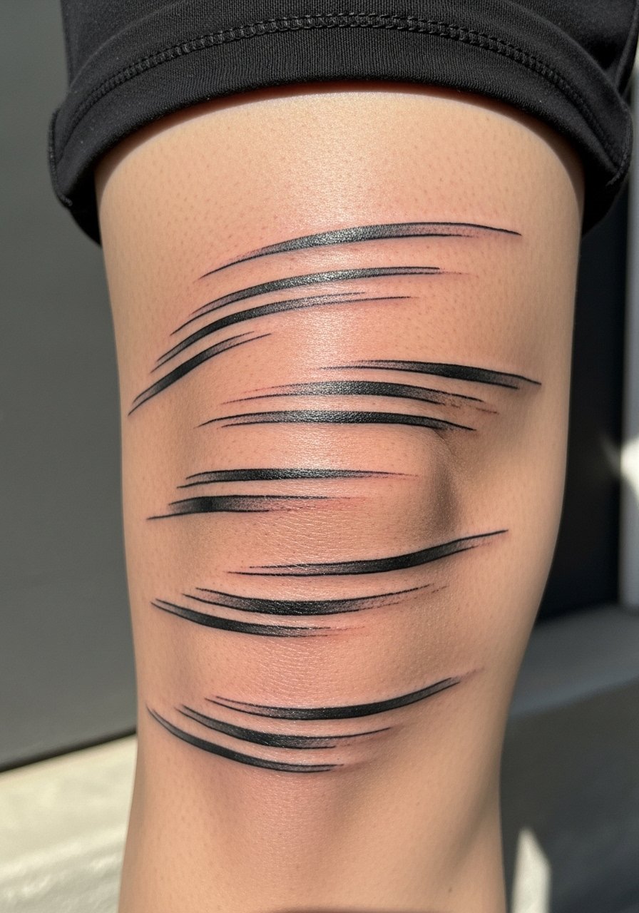 Knee-area tattoos are conspicuous and move with the joint. Pain is high during tattooing. Speed effects here accentuate motion and pair well with other limb pieces. I’ve noticed that bold line anchors and generous spacing prevent ink smudging as the skin flexes. Plan placement carefully to avoid lines splitting across joints.