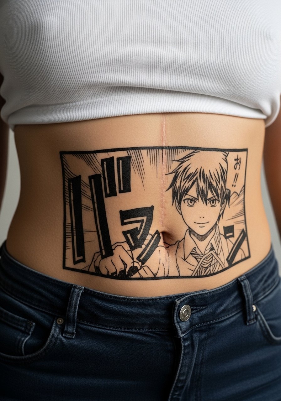 Speed lines are a manga staple for motion and drama. Ribcage placement reads cinematic but hurts—expect intense pain and longer healing. Blackwork is forgiving though; heavy black ages predictably. From my experience, artists who plan line direction with body movement make speed lines feel natural. Avoid placing too many thin parallel lines on ribs—skin stretches and can cause lines to blur together. Let negative space do work here; it enhances the sense of motion and keeps the piece legible.