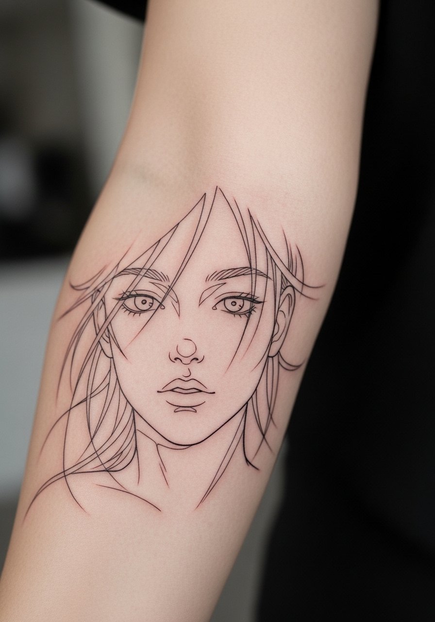 I first noticed this on a friend who wanted subtle fandom without full color. Fine line manga faces work visually because the negative space mimics manga panels. Expect mild pain on the inner forearm. Sessions are short, usually under an hour for a single head. Ask your artist for slightly heavier outer contour lines so the face stays readable after one to two years. A common error I see is asking for ultra-thin single hairlines. Those blur into gray threads after 12 months. For aftercare, I used Aquaphor the first three days, and that helped keep scabs thin. If you want this on the wrist instead, plan for touch-ups sooner since wrist skin shifts and fades faster.
